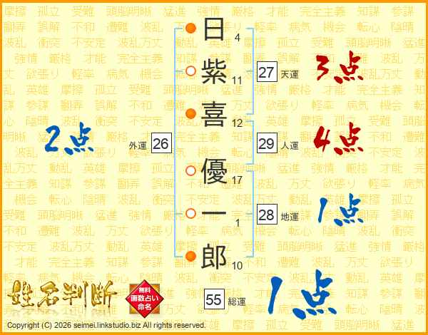 日(4画)紫(11画)喜(12画) 優(17画)一(1画)郎(10画)