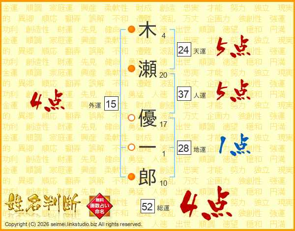 木瀬優一郎さんの総運は52画の4点!