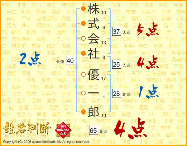 株(10画)式(6画)会(13画)社(8画) 優(17画)一(1画)郎(10画)