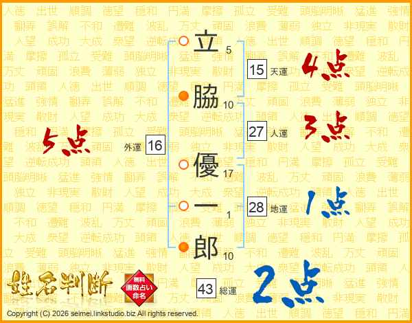 立(5画)脇(10画) 優(17画)一(1画)郎(10画)