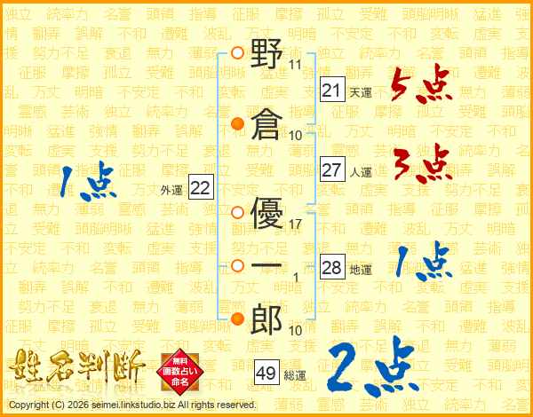 野(11画)倉(10画) 優(17画)一(1画)郎(10画)