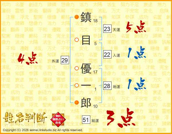 鎮(18画)目(5画) 優(17画)一(1画)郎(10画)