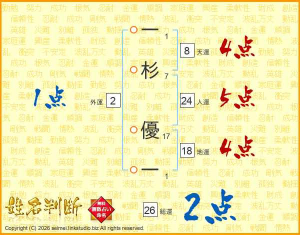 生活面を象徴する運勢です。外部から受ける影響力を表し、結婚運、家庭運や職場、環境への順応性を表します。総運から人運を引いた画数。姓や名が1文字の場合を除く。