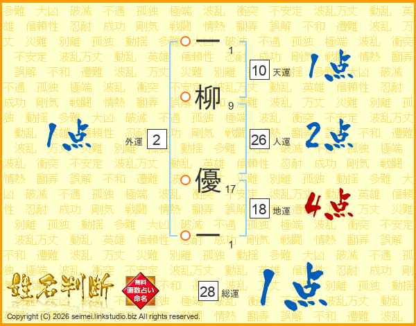 画数の奇数(○陽)と偶数(●陰)の配列で吉凶を占います。どちらかにかたよる名前は大凶名で避ける必要があります。画数の奇数偶数。