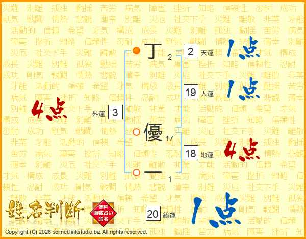 生活面を象徴する運勢です。外部から受ける影響力を表し、結婚運、家庭運や職場、環境への順応性を表します。総運から人運を引いた画数。姓や名が1文字の場合を除く。