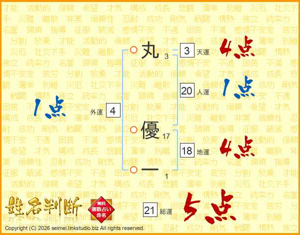 生活面を象徴する運勢です。外部から受ける影響力を表し、結婚運、家庭運や職場、環境への順応性を表します。総運から人運を引いた画数。姓や名が1文字の場合を除く。