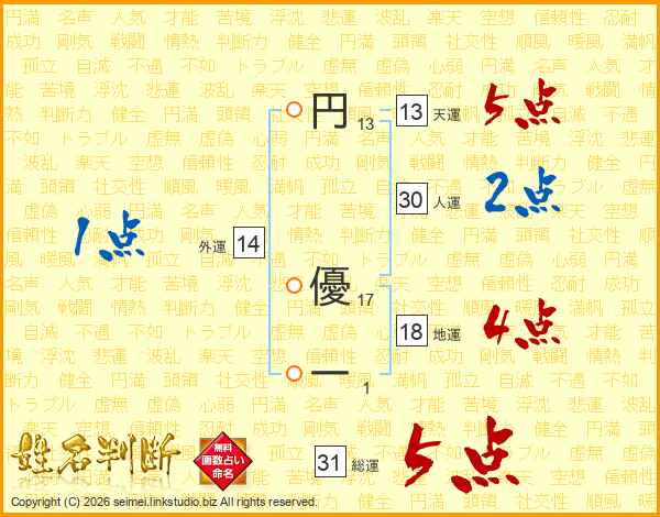 円優一さんの総運は31画の5点!