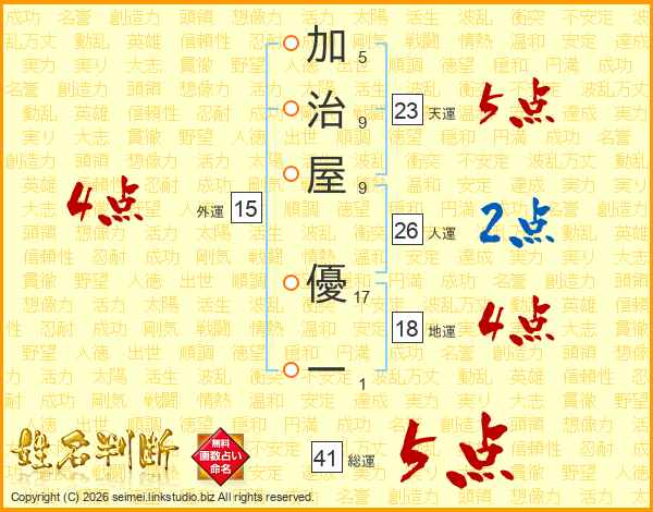 加(5画)治(9画)屋(9画) 優(17画)一(1画)
