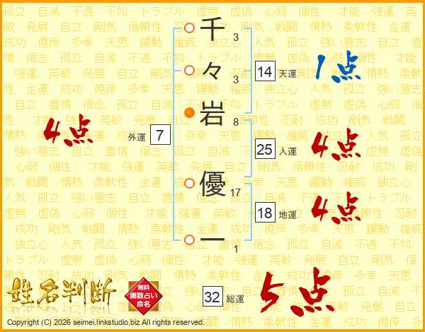 千(3画)々(3画)岩(8画) 優(17画)一(1画)