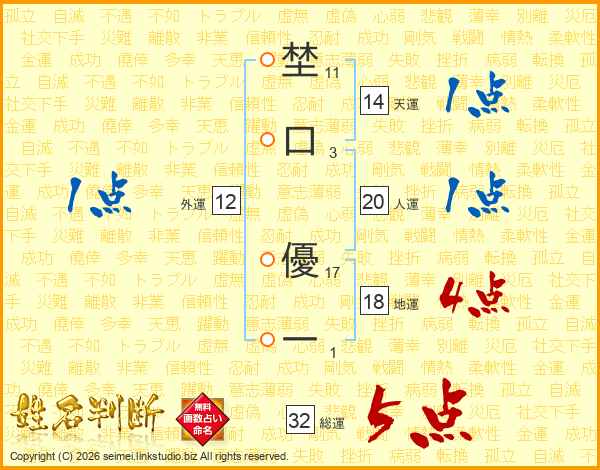 生活面を象徴する運勢です。外部から受ける影響力を表し、結婚運、家庭運や職場、環境への順応性を表します。総運から人運を引いた画数。姓や名が1文字の場合を除く。