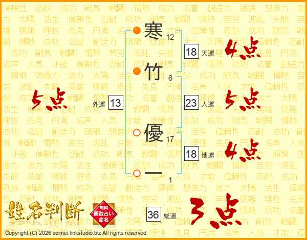 あなたの人生を表す1番重要な運勢です。生涯を通じて影響する総合運となり、主に50歳以降の晩年期に影響を及ぼします。苗字と名前の合計画数。