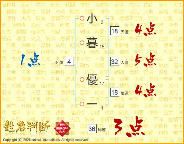 小(3画)暮(15画) 優(17画)一(1画)