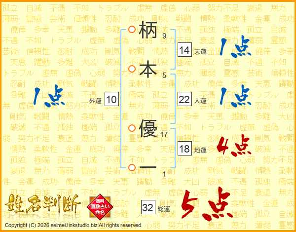柄(9画)本(5画) 優(17画)一(1画)