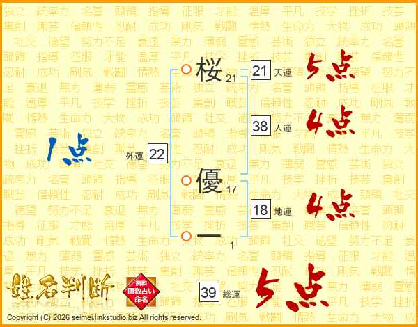 あなたの人生を表す1番重要な運勢です。生涯を通じて影響する総合運となり、主に50歳以降の晩年期に影響を及ぼします。苗字と名前の合計画数。