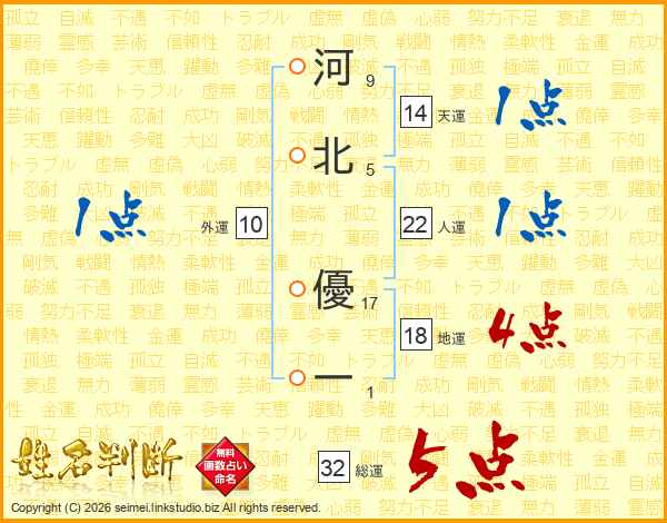生活面を象徴する運勢です。外部から受ける影響力を表し、結婚運、家庭運や職場、環境への順応性を表します。総運から人運を引いた画数。姓や名が1文字の場合を除く。