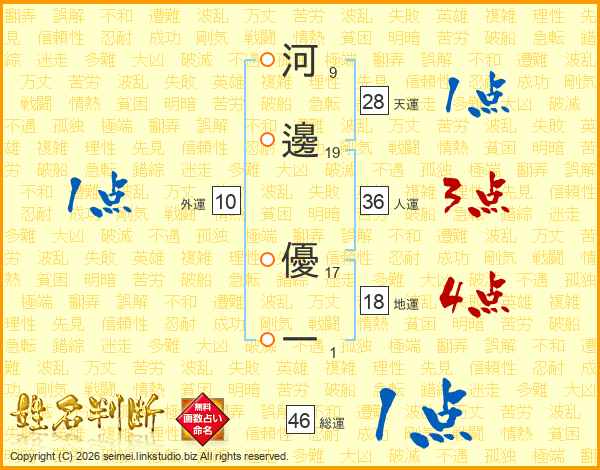 生活面を象徴する運勢です。外部から受ける影響力を表し、結婚運、家庭運や職場、環境への順応性を表します。総運から人運を引いた画数。姓や名が1文字の場合を除く。