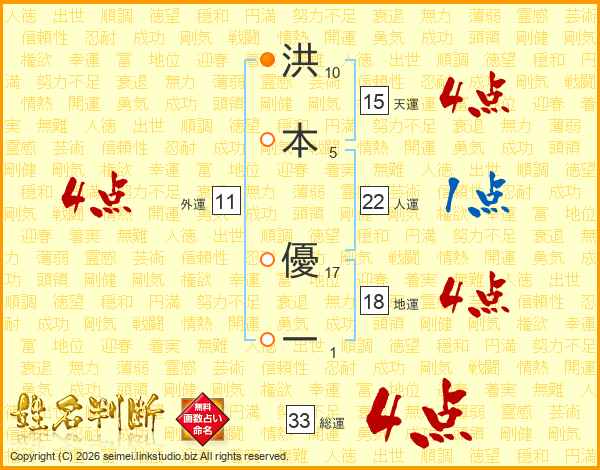 洪本優一さんの総運は33画の4点!