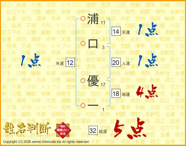 浦口優一さんの総運は32画の5点!