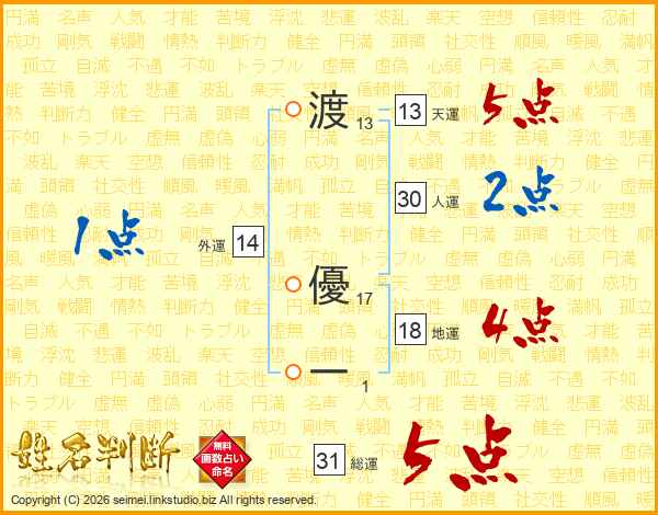 生活面を象徴する運勢です。外部から受ける影響力を表し、結婚運、家庭運や職場、環境への順応性を表します。総運から人運を引いた画数。姓や名が1文字の場合を除く。