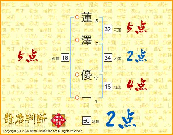 蓮(15画)澤(17画) 優(17画)一(1画)