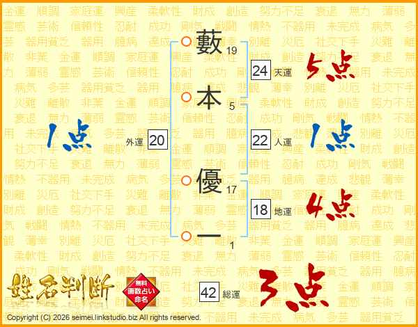 藪本優一さんの天運は24画の5点!