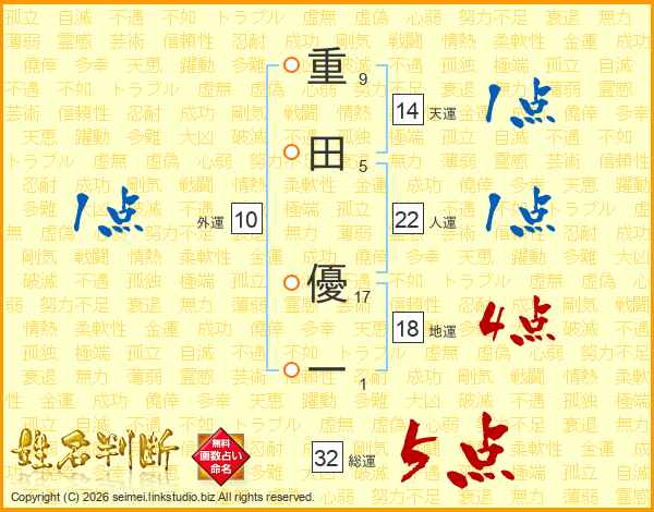 生活面を象徴する運勢です。外部から受ける影響力を表し、結婚運、家庭運や職場、環境への順応性を表します。総運から人運を引いた画数。姓や名が1文字の場合を除く。