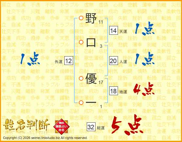 野口優一さんの総運は32画の5点!