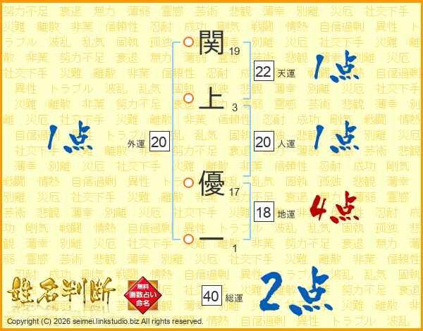 生活面を象徴する運勢です。外部から受ける影響力を表し、結婚運、家庭運や職場、環境への順応性を表します。総運から人運を引いた画数。姓や名が1文字の場合を除く。
