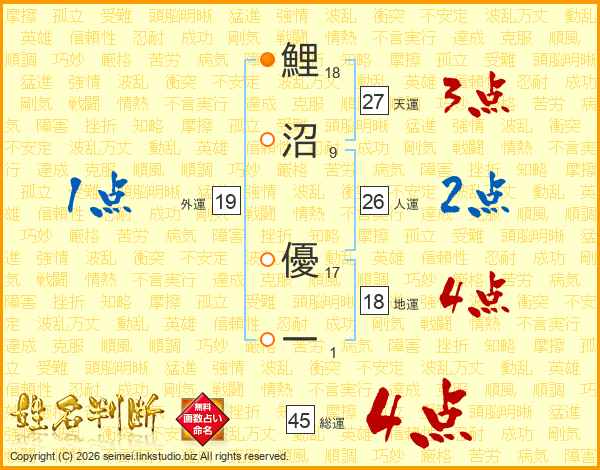 鯉沼優一さんの総運は45画の4点!
