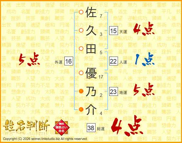 佐(7画)久(3画)田(5画) 優(17画)乃(2画)介(4画)