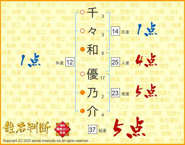 千(3画)々(3画)和(8画) 優(17画)乃(2画)介(4画)