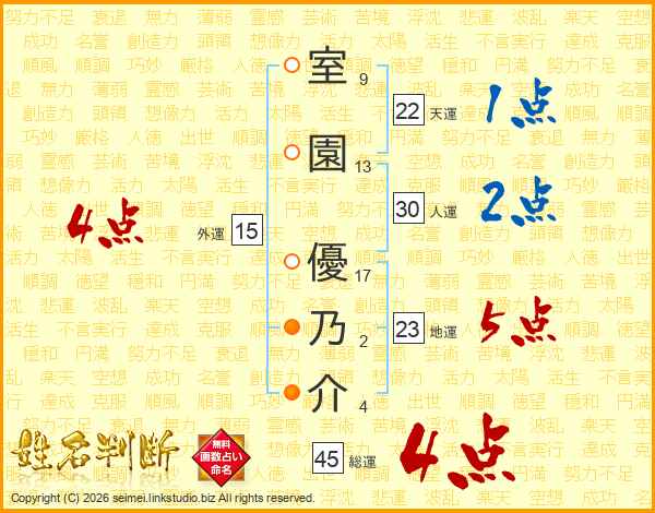 室(9画)園(13画) 優(17画)乃(2画)介(4画)