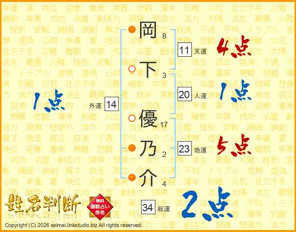岡下優乃介さんの総運は34画の2点!