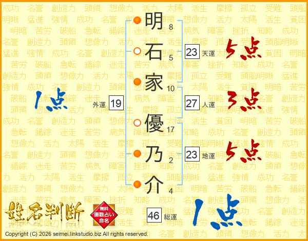 明(8画)石(5画)家(10画) 優(17画)乃(2画)介(4画)