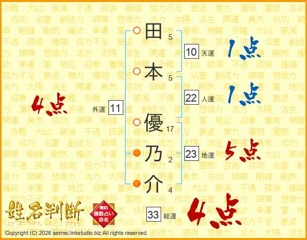 田(5画)本(5画) 優(17画)乃(2画)介(4画)