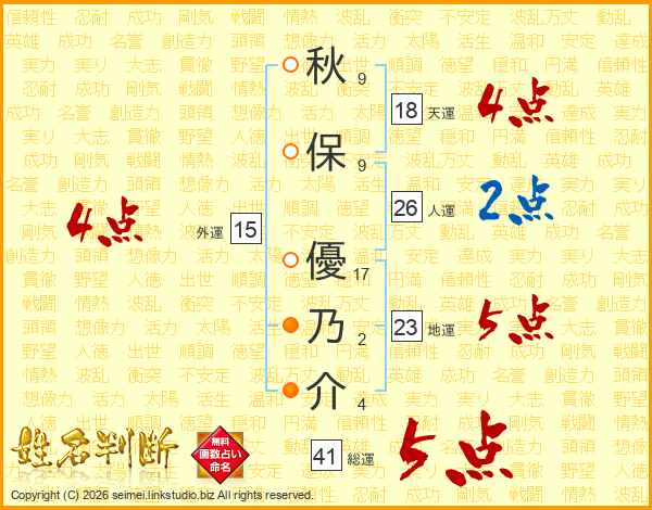 秋(9画)保(9画) 優(17画)乃(2画)介(4画)