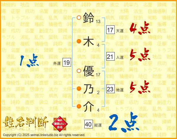 鈴(13画)木(4画) 優(17画)乃(2画)介(4画)