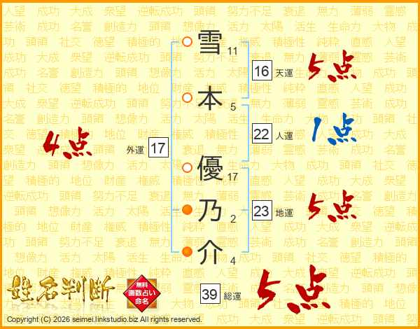 雪(11画)本(5画) 優(17画)乃(2画)介(4画)