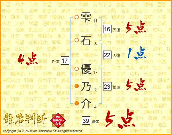 雫(11画)石(5画) 優(17画)乃(2画)介(4画)