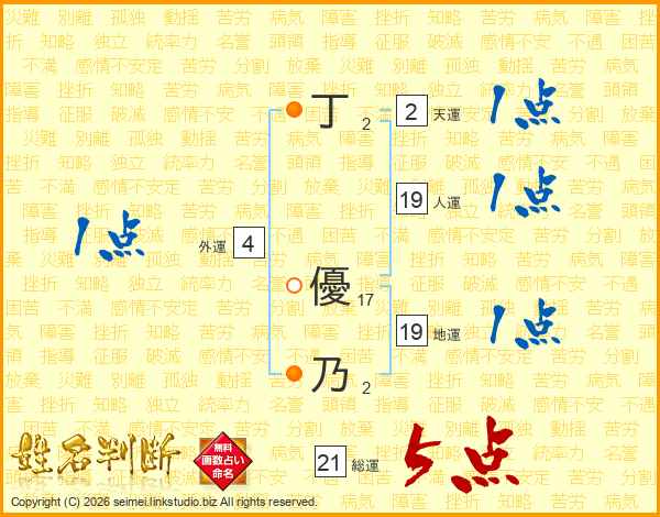 生活面を象徴する運勢です。外部から受ける影響力を表し、結婚運、家庭運や職場、環境への順応性を表します。総運から人運を引いた画数。姓や名が1文字の場合を除く。