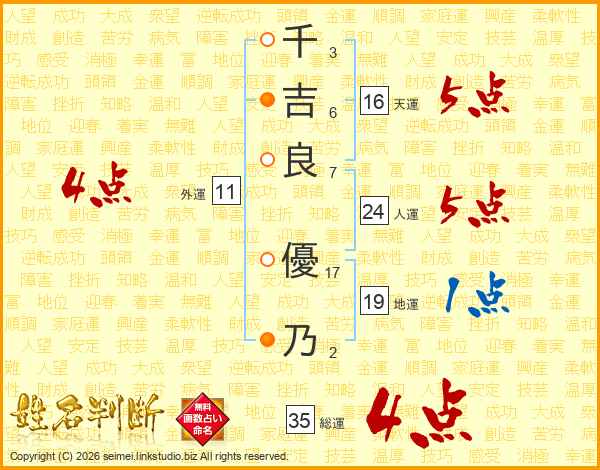 千(3画)吉(6画)良(7画) 優(17画)乃(2画)