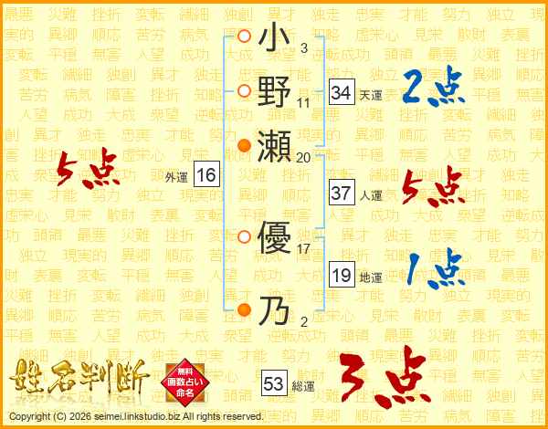 小野瀬優乃さんの総運は53画の3点!