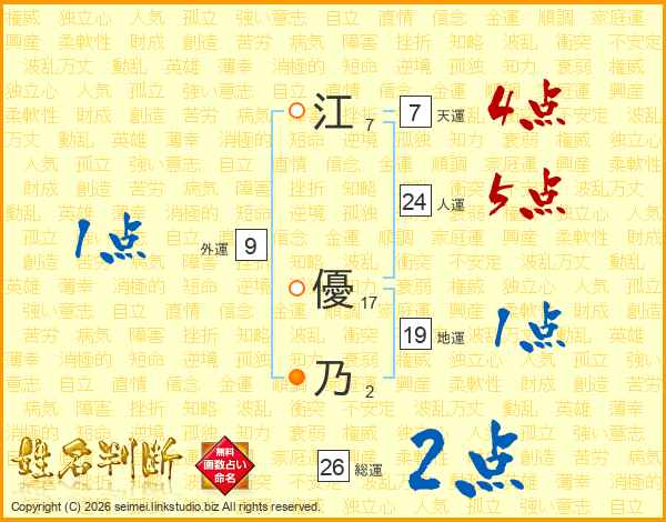 生活面を象徴する運勢です。外部から受ける影響力を表し、結婚運、家庭運や職場、環境への順応性を表します。総運から人運を引いた画数。姓や名が1文字の場合を除く。