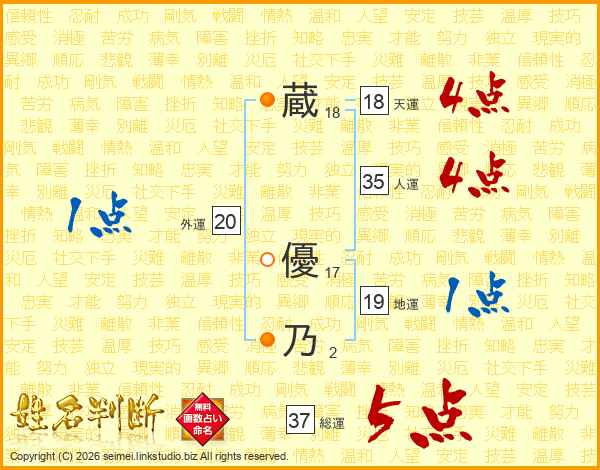 蔵(18画) 優(17画)乃(2画)