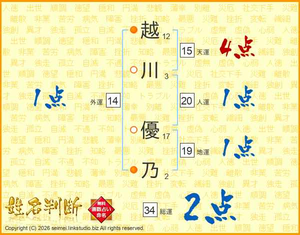生活面を象徴する運勢です。外部から受ける影響力を表し、結婚運、家庭運や職場、環境への順応性を表します。総運から人運を引いた画数。姓や名が1文字の場合を除く。