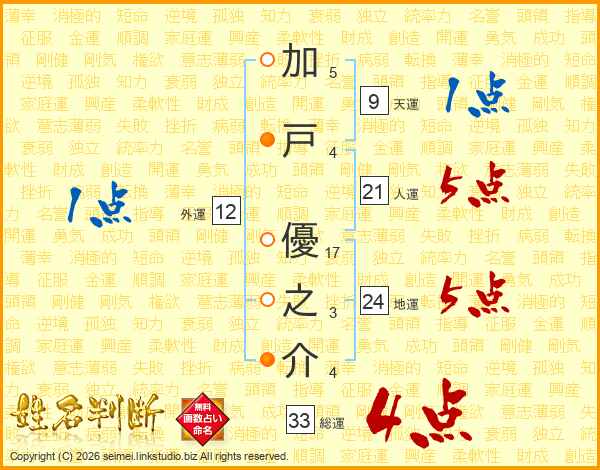 加(5画)戸(4画) 優(17画)之(3画)介(4画)