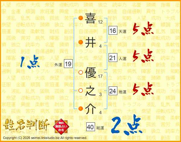 喜(12画)井(4画) 優(17画)之(3画)介(4画)