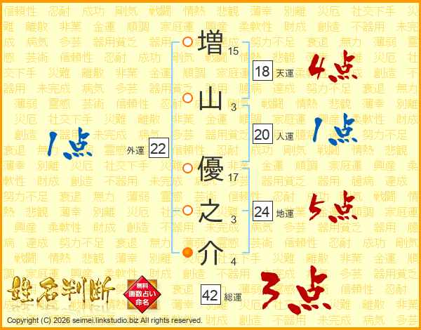 増(15画)山(3画) 優(17画)之(3画)介(4画)