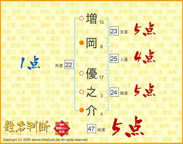 増(15画)岡(8画) 優(17画)之(3画)介(4画)