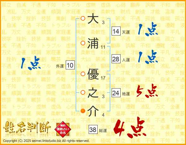 大(3画)浦(11画) 優(17画)之(3画)介(4画)